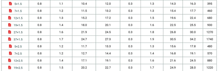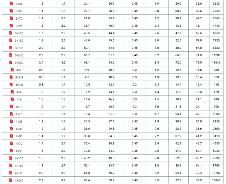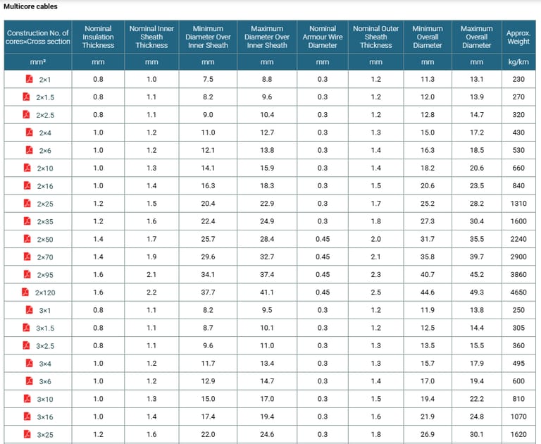 Construction No. of cores×Cross section | Nominal Insulation Thickness | Nominal Inner Sheath Thickness | Minimum Diameter Over Inner Sheath | Maximum Diameter Over Inner Sheath | Nominal Armour Wire Diameter | Nominal Outer Sheath Thickness | Minimum Overall Diameter | Maximum Overall Diameter | Approx. Weight |