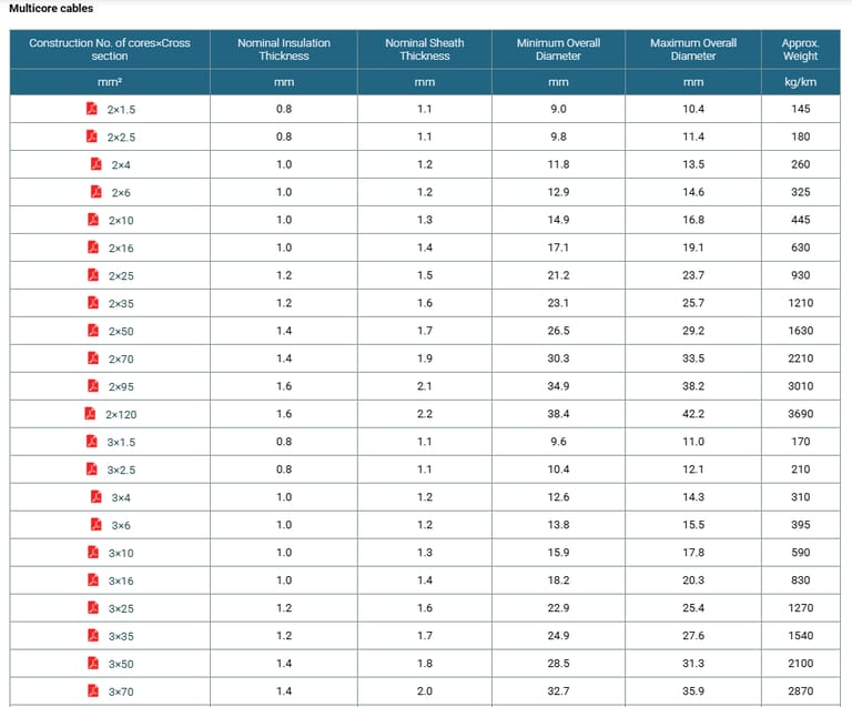 Conductor : Tinned copper wire stranded circular cl. 2 BS 6360/IEC 60228.