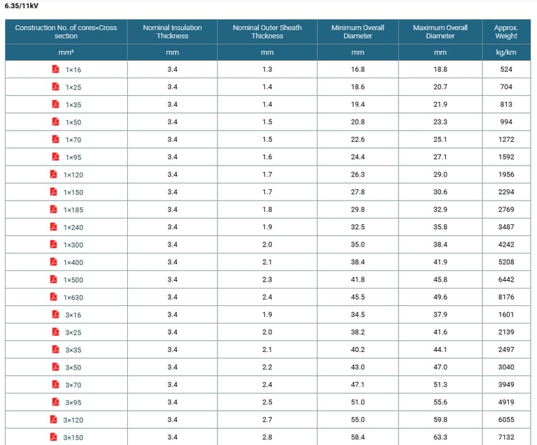Construction No. of cores×Cross section | Nominal Insulation Thickness | Nominal Outer Sheath Thickness | Minimum Overall Diameter | Maximum Overall Diameter | Approx. Weight |