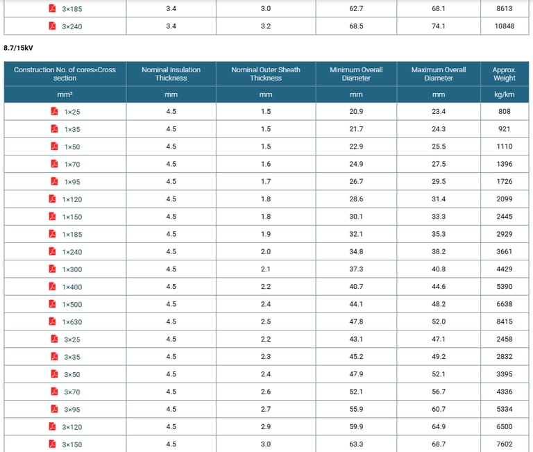 3.8/6.6kV, 6.35/11kV, 8.7/15kV HF-EPR Insulated, SW2/SW4 Sheathed Unarmoured Flame Retardant Power & Control Cables (Radial Field)