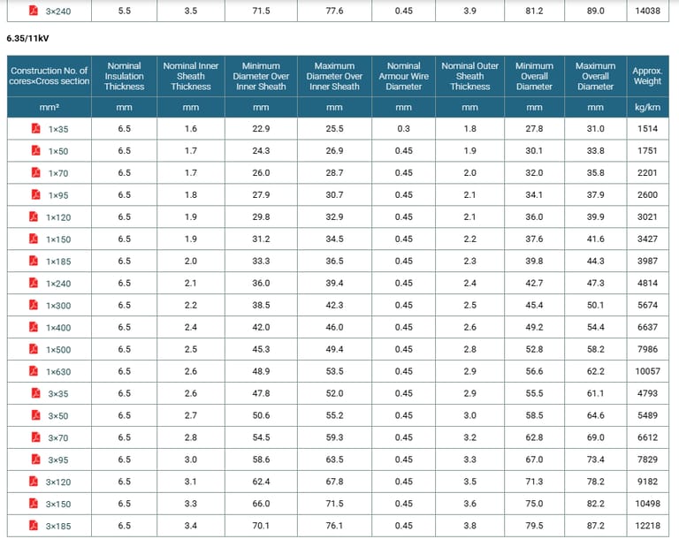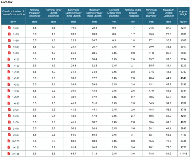 Construction No. of cores×Cross section | Nominal Insulation Thickness | Nominal Inner Sheath Thickness | Minimum Diameter Over Inner Sheath | Maximum Diameter Over Inner Sheath | Nominal Armour Wire Diameter | Nominal Outer Sheath Thickness | Minimum Overall Diameter | Maximum Overall Diameter | Approx. Weight |