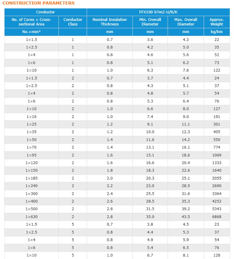 FFX100 07mZ-K : 1.5-240mm² Class 5 stranded copper conductor to BS EN 60228.