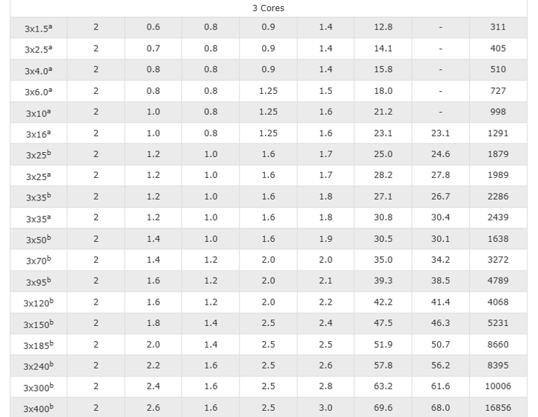 Nominal Cross Section Area | Two-core cables d.c. | Two-core cable, single-phase a.c. | Three- or four-core cable, three-phase a.c. | ||||