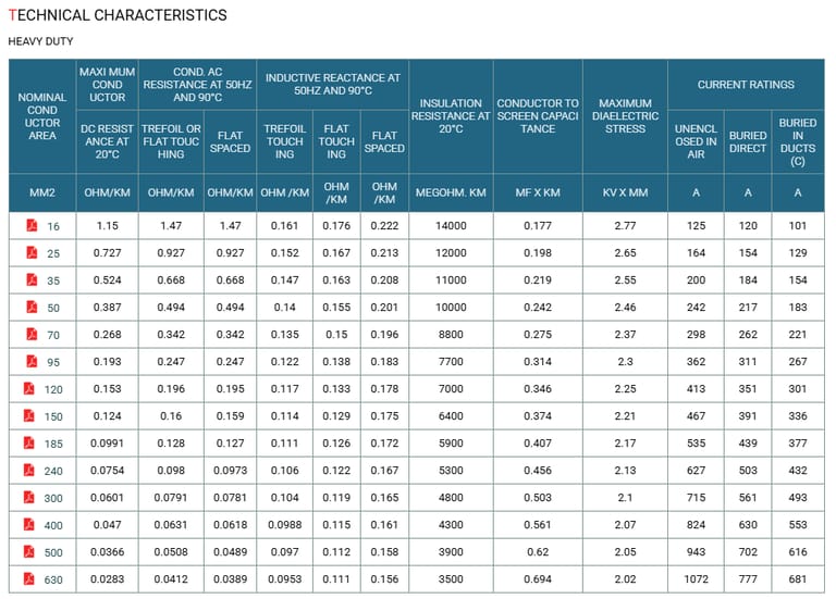 DC RESISTANCE AT 20°C | TREFOIL OR FLAT TOUC HING | FLAT SPACED | TREFOIL TOUC HING | FLAT TOUC HING | FLAT SPACED | UNENC LOSED? IN AIR | BURIED DIRECT | BURIED IN DUCTS (C) | ||||