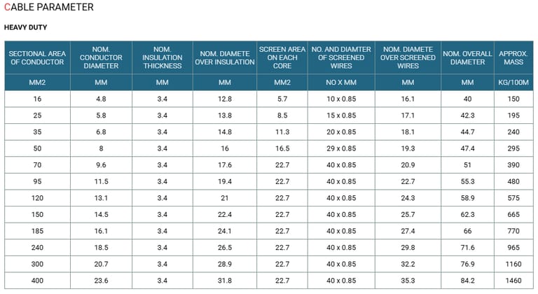 SECTIONAL AREA OF CONDUCTOR | NOM. CONDUCTOR DIAMETER | NOM. INSULATION THICKNESS | NOM. DIAMETE OVER INSULATION | SCREEN AREA ON EACH CORE | NO. AND DIAMTER OF SCREENED WIRES | NOM. DIAMETE OVER SCREENED WIRES | NOM. OVERALL DIAMETER | APPROX. MASS |