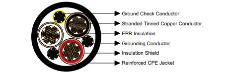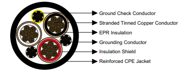 The extra-heavy-duty Chlorinated Polyethylene (CPE) jacket is oil, chemical, abrasion, and flame resistant. Its design protects the cable in tough mining environments, from drag chains and reeling drums to wet and abrasive underground surfaces.