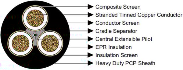 1×Central Extensible Pilot | EPR covered flexible stranded tinned copper conductor. |