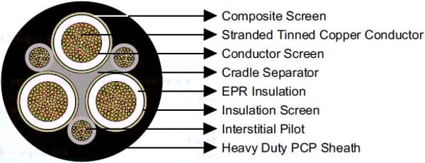3×Interstitial Pilot | EPR covered flexible stranded tinned copper conductor. |