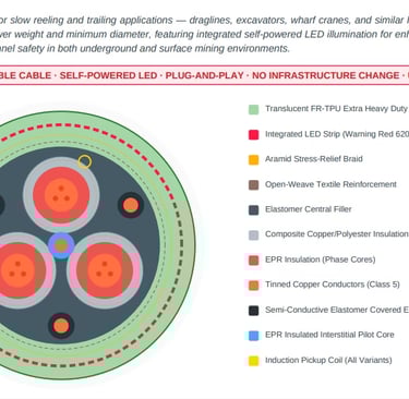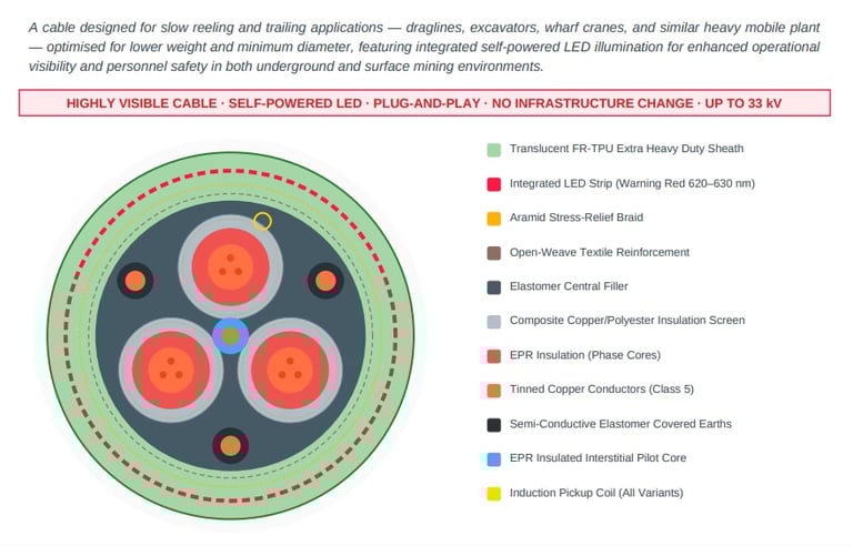 Discover how the AS/NZS TYPE 450-LED self-powered LED illuminated mining cable makes heavy, dark traditional cables visible 24/7 in South African mines. Reduce trip hazards, run-overs, arc flashes and downtime with electromagnetic induction-powered red LED glow – plug-and-play safety for draglines, excavators and underground operations.