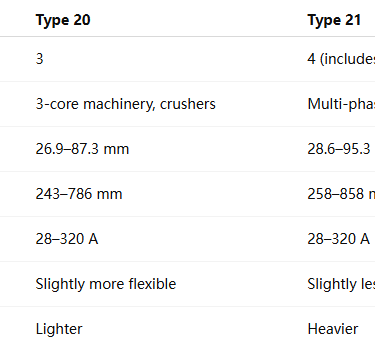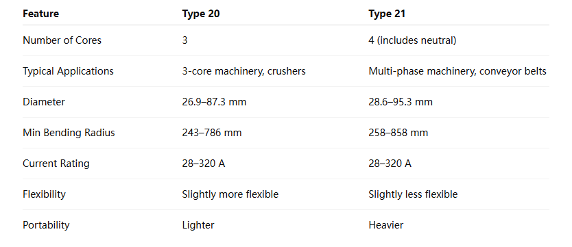 For a new underground copper mine, where machinery requires a neutral for balanced load, Type 21 is preferred. Type 20 is ideal for simpler 3-core equipment.