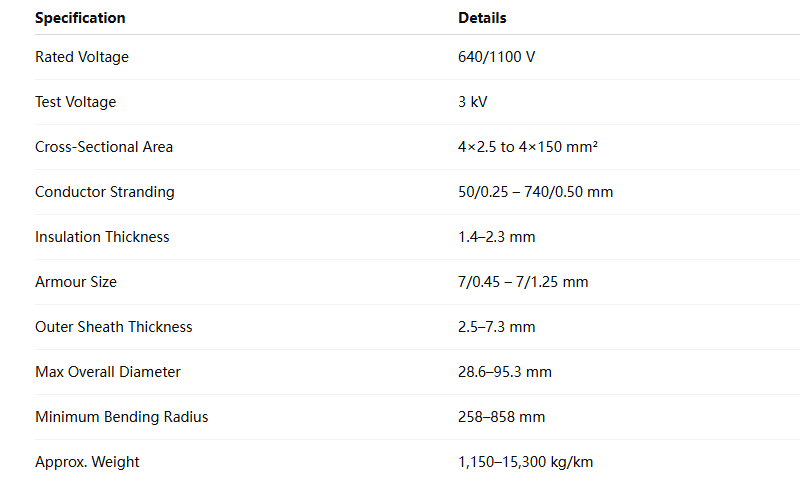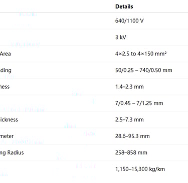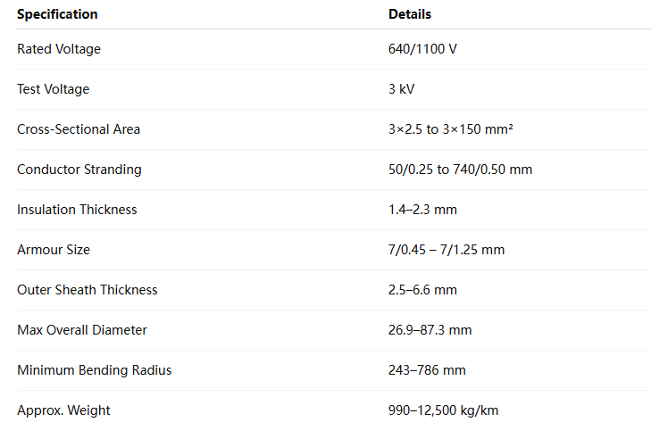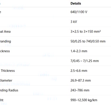 DC Resistance: Phase conductors 0.132–8.21 Ω/km, armour 0.41–4.2 Ω/km