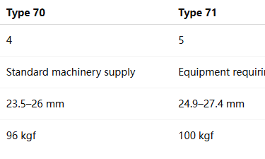 Overall diameter: Type 70 (23.5–26 mm), Type 71 (24.9–27.4 mm)