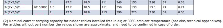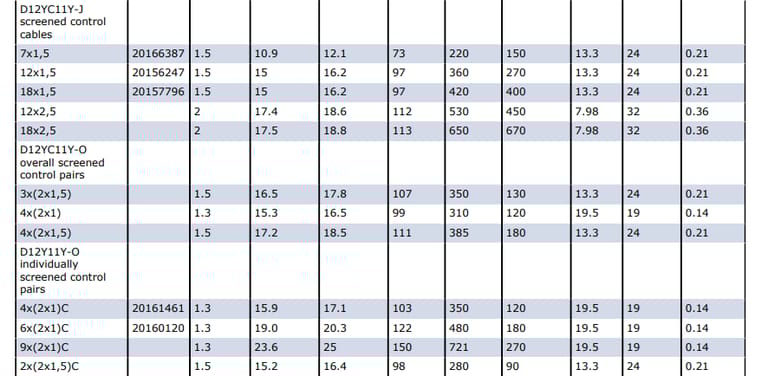 The cable comes in various configurations: single-core power cables (e.g., 1x25 mm² with 10.3-11.5 mm outer diameter, 330 kg/km weight), four-core (e.g., 4x1.5 mm² at 10.8-12 mm diameter), five-core, control cables (like 7x1.5 mm²), and screened pairs (e.g., 3x(2x1.5)C). Each has tailored specs, such as permissible tensile force (up to 3600 N for 1x240 mm²) and conductor resistance (e.g., 0.78 Ω/km at 20°C for 1x25 mm²).