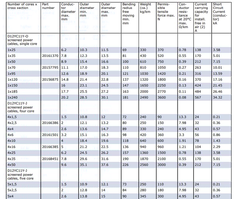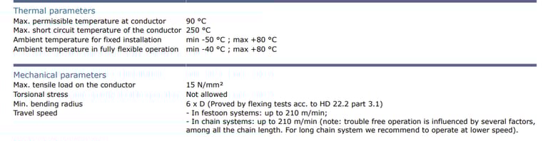 Mechanical Parameters: Max tensile load is 15 N/mm² on the conductor, with no torsional stress allowed to prevent twisting damage. The minimum bending radius is 6x the outer diameter (D), proven by flexing tests per HD 22.2 part 3.1. It supports travel speeds up to 210 m/min in festoon or chain systems, though longer chains may require slower speeds for reliability.