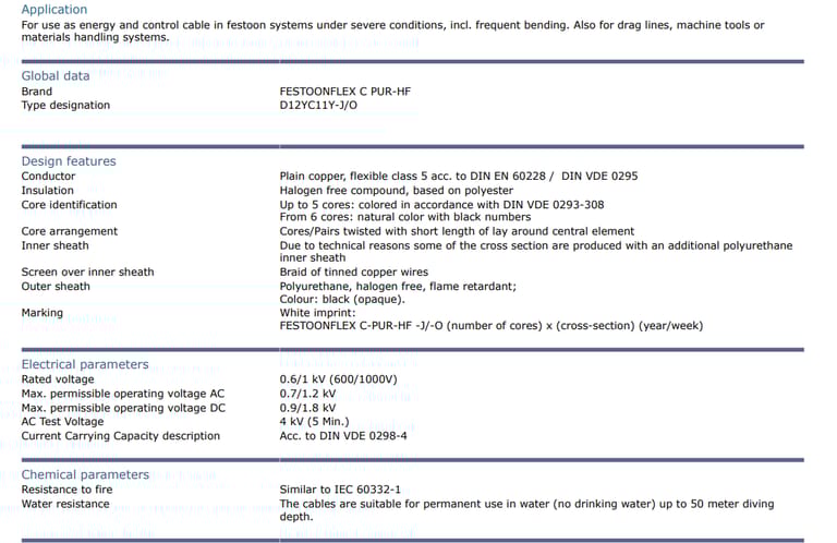 At its core, the FESTOONFLEX C-PUR-HF D12YC11Y is built with precision to handle low voltage applications up to 0.6/1 kV, ensuring safe and efficient power delivery. Let's break down its key features, using cable technology terminology to highlight its sophistication.