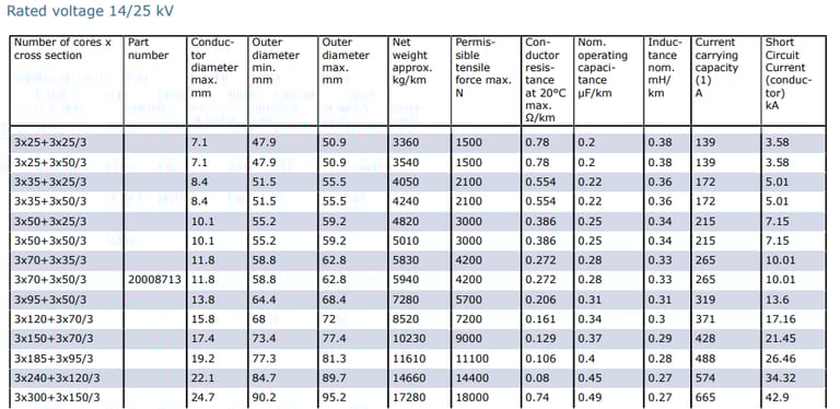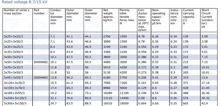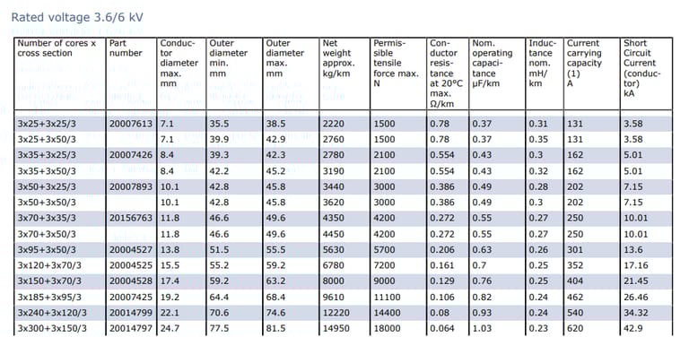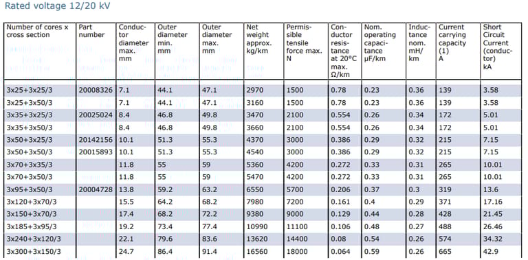 Number of Cores x Cross Section | Part Number | Conductor Diameter Max (mm) | Outer Diameter Min (mm) | Outer Diameter Max (mm) | Net Weight Approx (kg/km) | Permissible Tensile Force Max (N) | Conductor Resistance at 20°C Max (Ω/km) | Nominal Operating Capacitance (µF/km) | Inductance Nominal (mH/km) | Current Carrying Capacity (A) | Short Circuit Current (Conductor) (kA) |