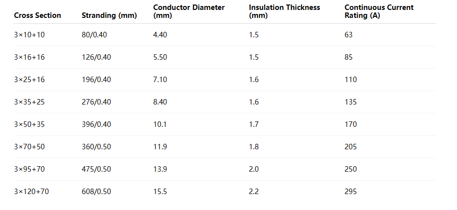The cable is available in various cross-sections, from 3×10+10 mm² to 3×120+70 mm², accommodating different current ratings and mechanical requirements. A typical table is as follows: