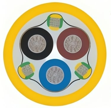 The three phase conductors are Class 5 flexible tinned copper, providing excellent conductivity while allowing dynamic bending without fracturing. Tinning prevents corrosion, particularly in wet or chemically aggressive environments.