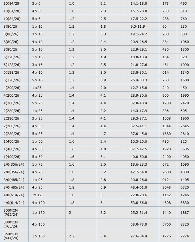 Max operating voltage in single or three phase system is Uo/U 476/825 volts. In a direct current system max operating voltage is Uo/U 619/1238 volts. If in a fixed or protected installation Uo/U is 600/1000 volts. These cables are resistant to flame, acids, and oil penetration.