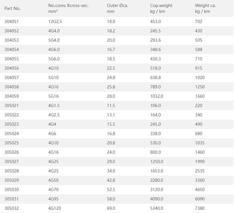 Part No. | No.cores Xcross-sec. | Outer Øca. | Cop.weight | Weight ca. |