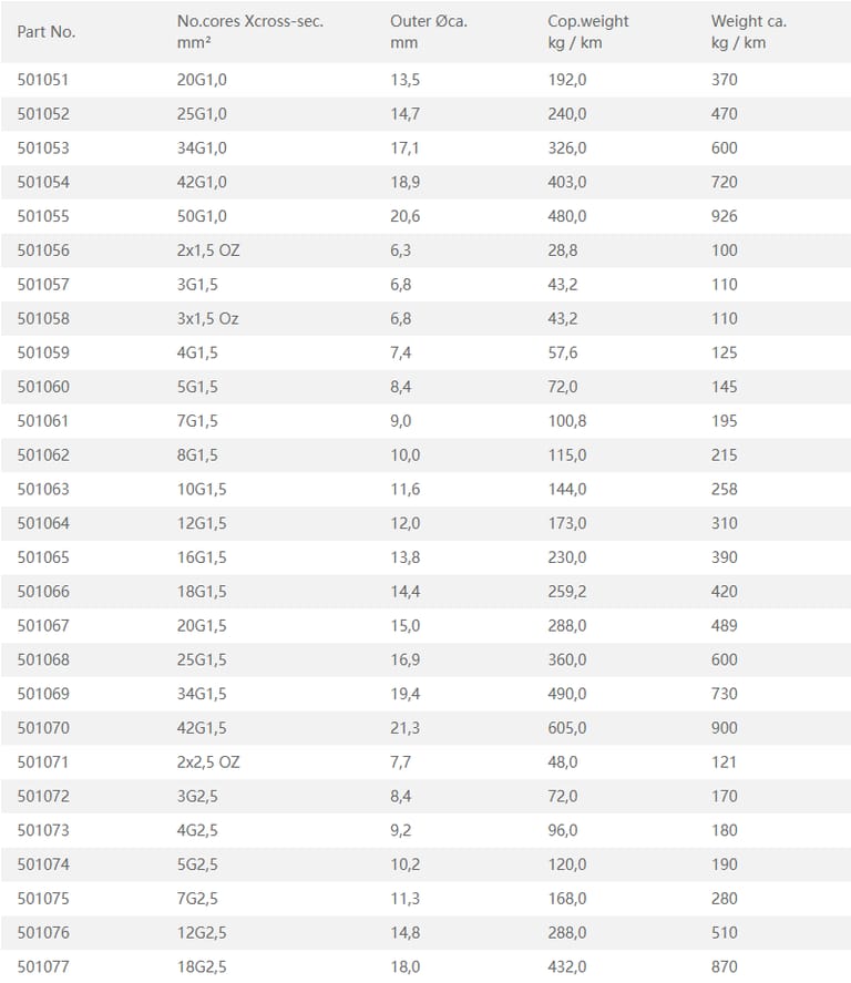 Part No. | No.cores Xcross-sec. | Outer Øca. | Cop.weight | Weight ca. |