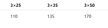 Phase conductor DC resistance (Ω/km at 20°C): 1.95–0.164 depending on size