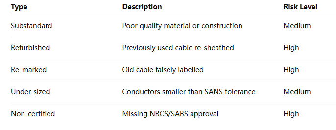 This refers to cables that fail to meet SANS, IEC, or BS standards due to under-sized conductors, poor insulation, or substandard armour—even if they are not outright counterfeits.