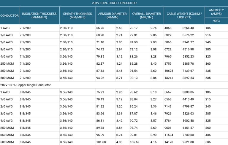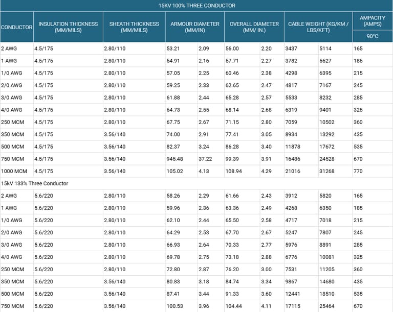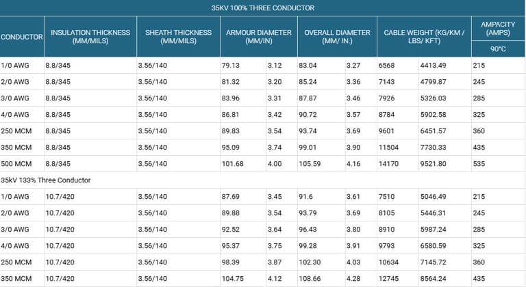 The three core cables are designed for distribution of electrical power with nominal voltage Uo/ U ranging from 5KV to 46KV and frequency 50Hz. Three core cables are made of stranded copper or aluminium conductor, triple extruding insulating system consisting of thermosetting semi-conducting conductor shield, XLPE/TR-XLPE/EPR insulation and thermosetting semiconducting insulation shield. There are a number of designs of metallic shields including the copper tape helically applied with overlap, copper wire shield, concentric neutral, longitudinally applied corrugated copper tape and metal sheath available, which are surrounded with fillers and grounding conductor, overall binder tape and overall PVC, LSZH or PE jacket.