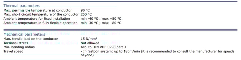 Tensile load caps at 15 N/mm² per conductor, with no torsional stress allowed—emphasizing one-plane bending. Minimum bending radius adheres to DIN VDE 0298 part 3, and travel speeds reach 180 m/min in festoon systems (consult manufacturer for higher). This enables high-speed operations in dynamic setups.