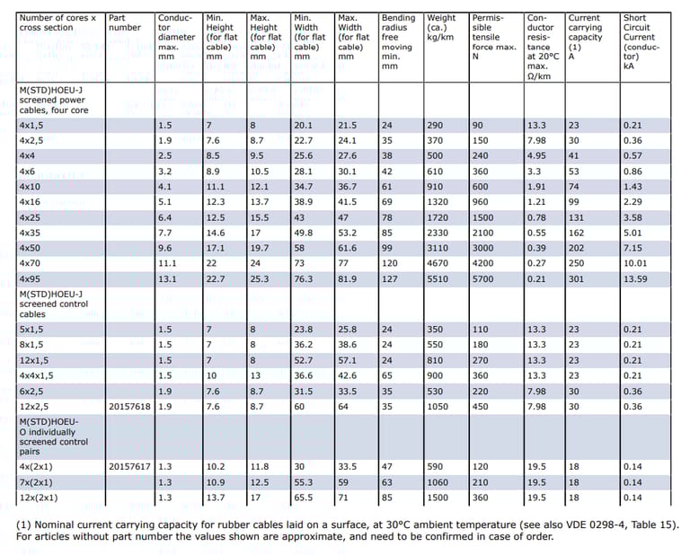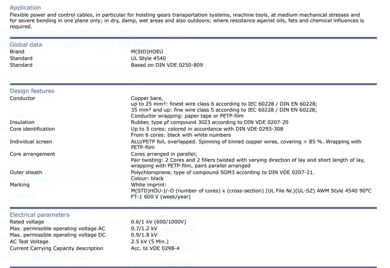 For control cables, variants include individually screened pairs (M(StD)HOEU-O) or overall screened (M(StD)HOEU-J), catering to power or signal needs.