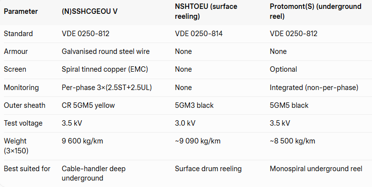 Choose the (N)SSHCGEOU V whenever cables run in protection chains or handlers in deep South African mines. NSHTOEU lacks armour and monitoring; Protomont(S) is lighter but cannot handle the compressive loads of chain systems.