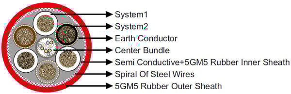 Center Bundle | Control and pilot cores withcopper/steel conductors capable of expansion andcompression, EPR insulation,optional with fiber optics, covered with tinned copper wires semi conductive rubber sheath. |