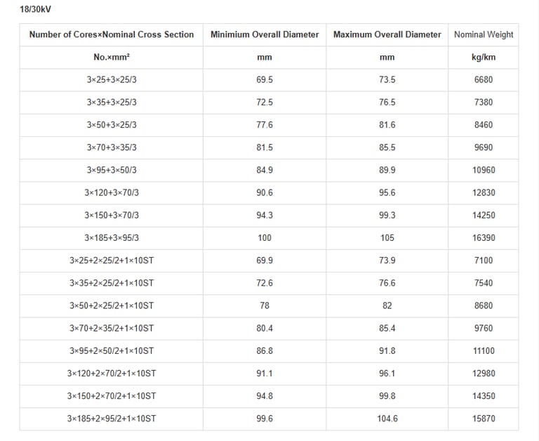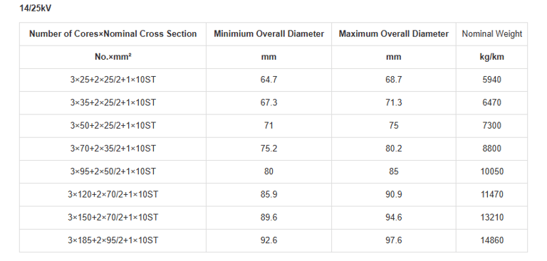 Number of Cores×Nominal Cross Section | Minimium Overall Diameter | Maximum Overall Diameter | Nominal Weight |