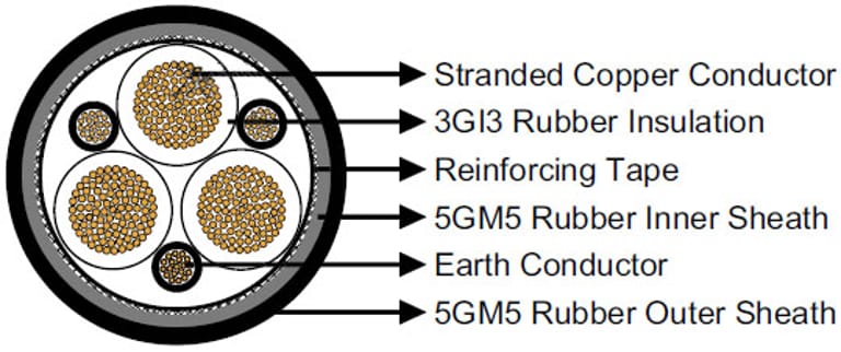 Outer Sheath | Rubber type 5GM5, abrasion and tear resistant, oil and ozone resistant, inseparably bonded with inner sheath. |