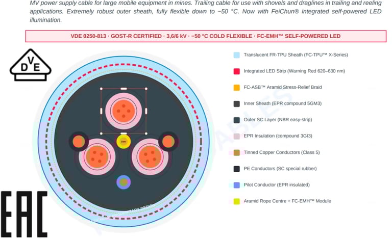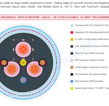 That’s why the arrival of the (N)TSCGEWOEU-LED 3.6/6 kV self-powered illuminated trailing cable from Feichun is generating serious interest among mine engineers, safety officers and production managers across the coalfields. Built to DIN VDE 0250-813 standards with GOST-R certification, this medium-voltage trailing cable doesn’t just carry power to your electric rope shovels and draglines – it lights itself up with a full-length red LED glow the moment it’s energised. No batteries, no external power packs, no fancy switchgear upgrades. Just plug it in, switch on, and watch the cable become visible even when it’s buried under coal dust or mud.