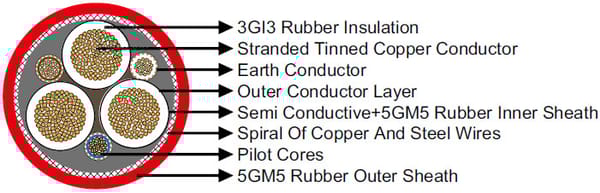 Outer Sheath | Rubber type 5GM5, abrasion and tear resistant, oil resistant and flame retardant. |