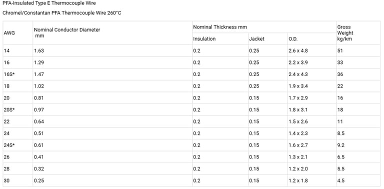Chromel/Alumel PFA Thermocouple Wire260°C