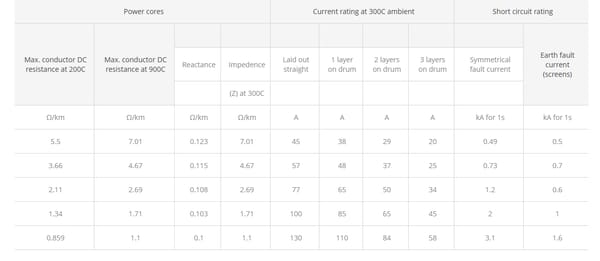 Core of Cable: Three tinned copper/nylon braid screened power cores and one unscreened pilot core laid up in the right hand lay around rubber (RD1) filler centre.