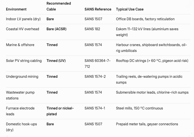 Tinned copper cable: Tin is sacrificial. It oxidises to SnO₂, protecting the copper underneath. SABS salt-spray tests show 5–10× longevity in wet/dry cycles. Real-world proof: Durban harbour cranes still humming on 15-year-old tinned 35 mm² after constant sea spray.