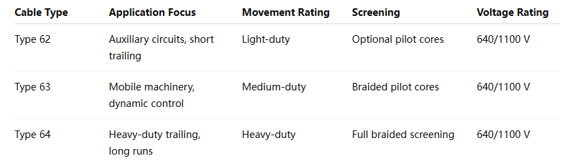 Type 63: Designed for medium-duty mobile equipment requiring screened pilot cores for signal integrity. Suitable for continuous miners and drill rigs.