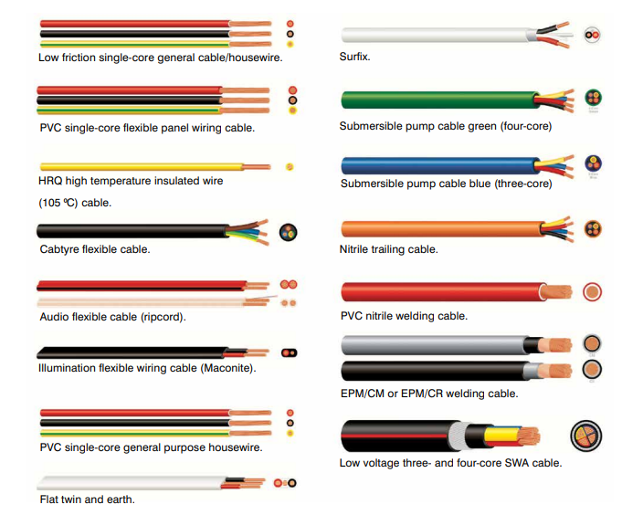 Standard installs include trenches for buried SWA, sleeves for protection, or ladders for overhead racking. PVC single-core housewire (general purpose) wires panels; flexible variants handle bends. Flat twin and earth – two cores plus earth – suits concealed wiring, while Surfix adds a sheath for surface runs. Cabtyre flexible cables power appliances, ripcord for audio, and Maconite for illumination. Submersible pump cables (green four-core or blue three-core) thrive underwater, nitrile trailing for mines, and welding cables (PVC nitrile or EPM/CR) endure arcs.