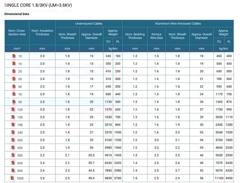 *Insulation Thickness of PVC is 3.4mm (1- 1600mm sq) for 3.6/6KV cables.