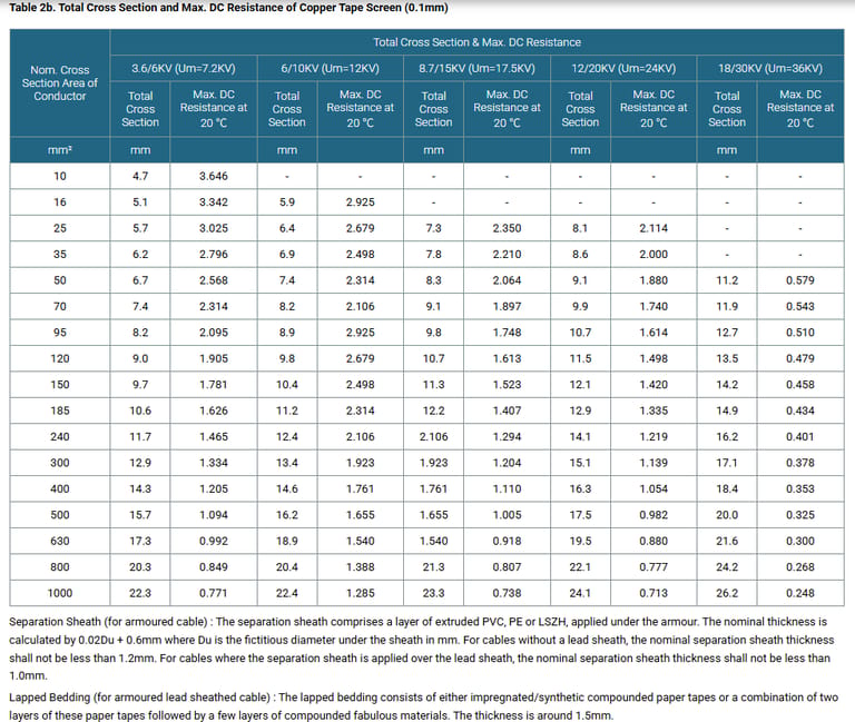 Metallic Layer : The concentric copper screen wire is applied over the insulation, or over the insulation screen or over an inner covering. As an alternative, copper tape(s) with minimum thickness of 0.1mm can be applied with overlap. Total cross section of copper wire screen and copper tape screen layer are shown in Table 2a and 2b.