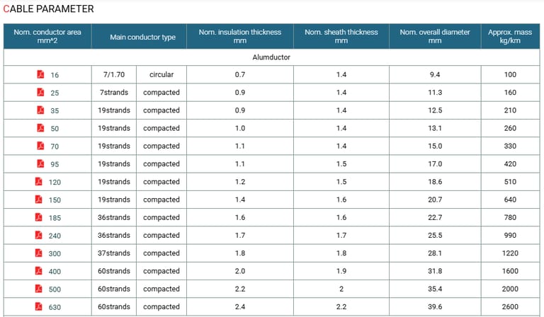 Nominal Area mm^2 | In conduit In Air | Buried In Ducts A | In conduit In Air | Buried In Ducts A | Maximum DC Resistance @20°C | Maximum AC Resistance @90°C | Reactance (trefoil) Ohm/km | 3 phase Voltage Drop mV/A |
