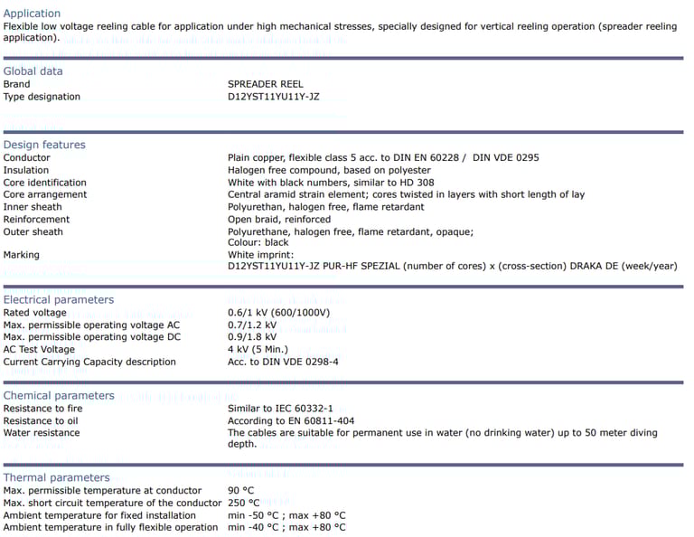 SPREADER REEL PUR-HF D12YST11YU11Y Low Voltage Cable PUR Sheathed for Vertical Reeling