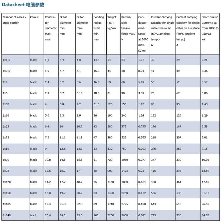 Electrical Tests | Meets VDE 0282 Section 2, HD 22.2, EN 50395 (Conductor Resistance, Test Voltages AC and DC, Electric Strength, Surface Resistance, Spark Test on Insulation); EN 50305 Part 6 DC stability (10 days, 85°C, salt water, 1500 V DC); Insulation Resistance at 20°C and 90°C in water; Feichun Internal Testing: Insulation Resistance at 120°C in air. |