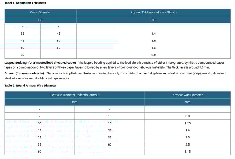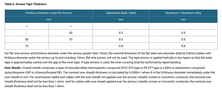 Outer Sheath: PVC, PE, or LSZH (Low Smoke Zero Halogen) for environmental resistance, with thickness calculated as 0.035D + 1 mm (D being the under-sheath diameter), minimum 1.4 mm for unarmoured cables.