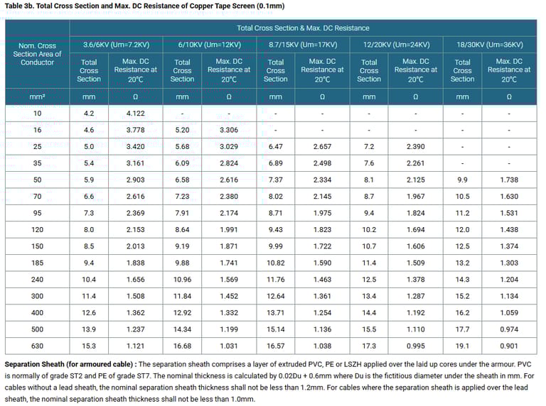 Metallic Layer : The concentric copper screen wire is applied over the insulation, or over the insulation screen or over an inner covering. As an alternative, copper tape(s) with minimum thickness of 0.1mm can be applied with overlap. Total cross section of copper wire screen and copper tape screen layer are shown in Table 3a and 3b.