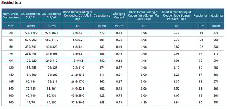 Metallic Layer : The metallic layer shall consist of either copper tapes or a concentric layer of copper wires or a combination of tapes and wires. The metallic layer provides an earth fault current path, capable of withstanding fault current to earth of 1000A for one second at maximum temperature 160°C. Copper wires are applied over the conducting water blocking layer with a minimum diameter of 0.5mm. As an alternative, copper tape(s) with minimum thickness of 0.1mm can be applied with overlap. Total cross section of copper wire screen and copper tape screen layer are shown in Table 2a and 2b.