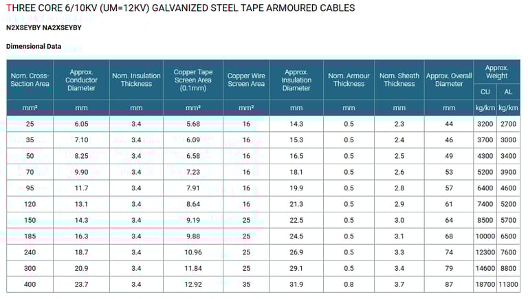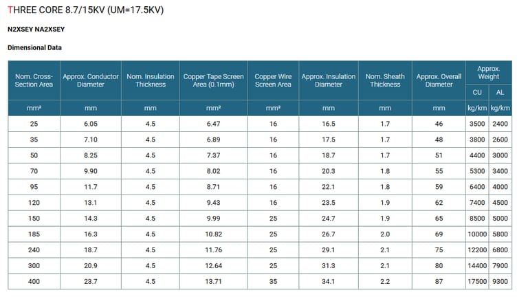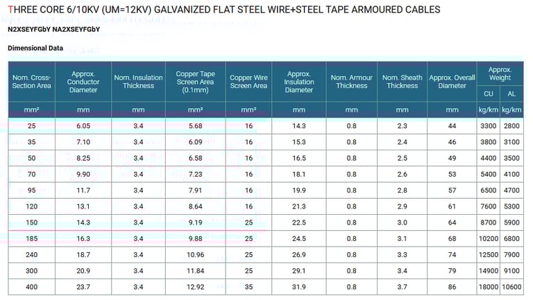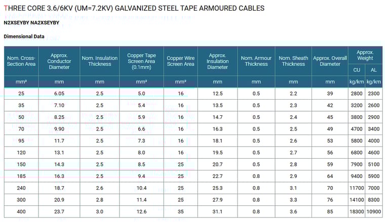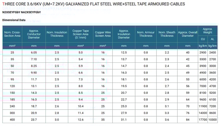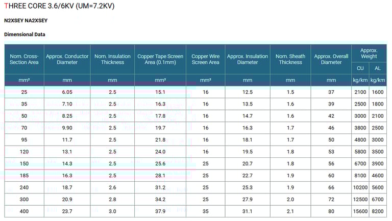 The three core cables are designed for distribution of electrical power with nominal voltage Uo/U ranging from 3.6/6KV to 18/30KV and frequency 50Hz. They are suitable for installation mostly in power supply stations, indoors and in cable ducts, outdoors, underground and in water as well as for installation on cable trays for industries, switchboards and power stations.